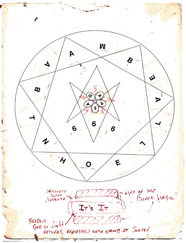 Just before beginning the intonation I noticed that its reverse (I'd intentionally used a piece of paper which had been used for two other workings) contained a circled 7-pointed star, surrounding a unicursal hexagram centered by a cinque-foil, point-down flower, the letters A-G-A-P-E in its leaves and S-A-T-A-N between these. The numbers 6-6-6 stood out before me then, the central being held firm in the lowest point of the unicursal, the rest lost to my double-vision and intention of the rite.